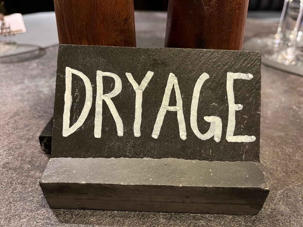 Now before you accuse the Nords of being ageist, take note that we had pre-ordered the dry aged beef. This has been hanging in the (presumably chilled) glass cabinet outside the restaurant since we boarded, right next to the glass tank the king crab was still trying to get out of. An order of the aged beef requires 24 hours notice, not sure why, and is a ‘big thing’. As a pair of big things ourselves, plus our British friends who are quite the opposite of that description, we fancied a flash beef meal to celebrate our wonderful journey and our friendship