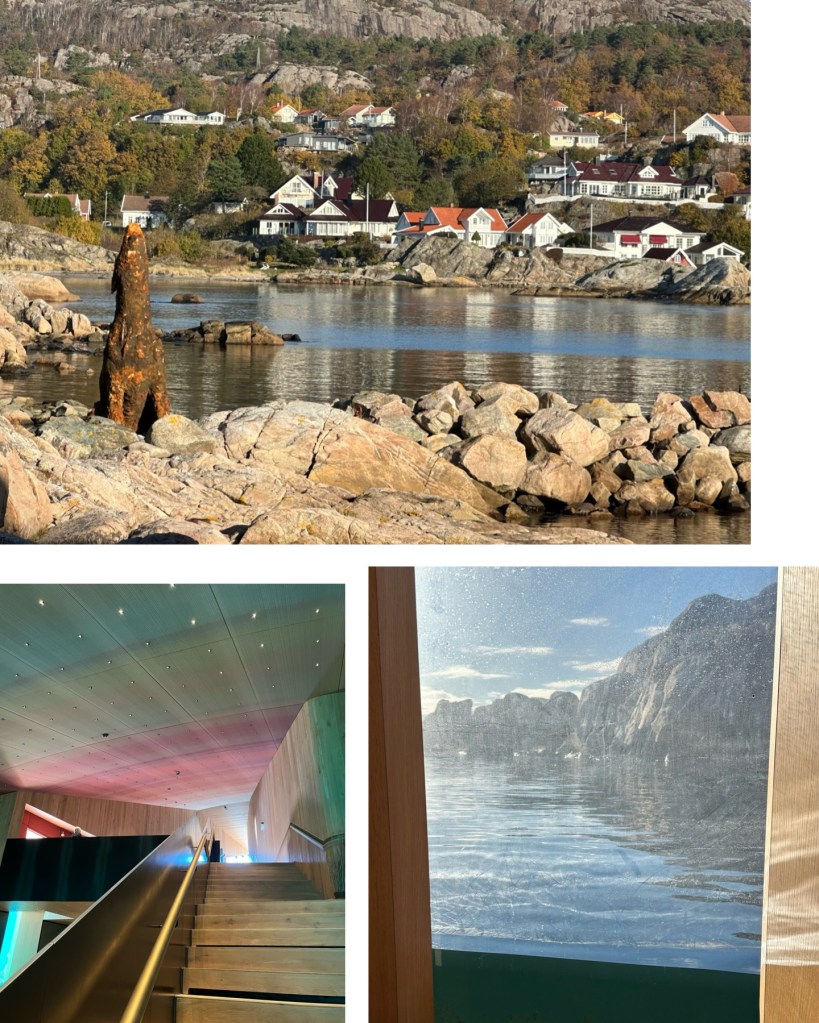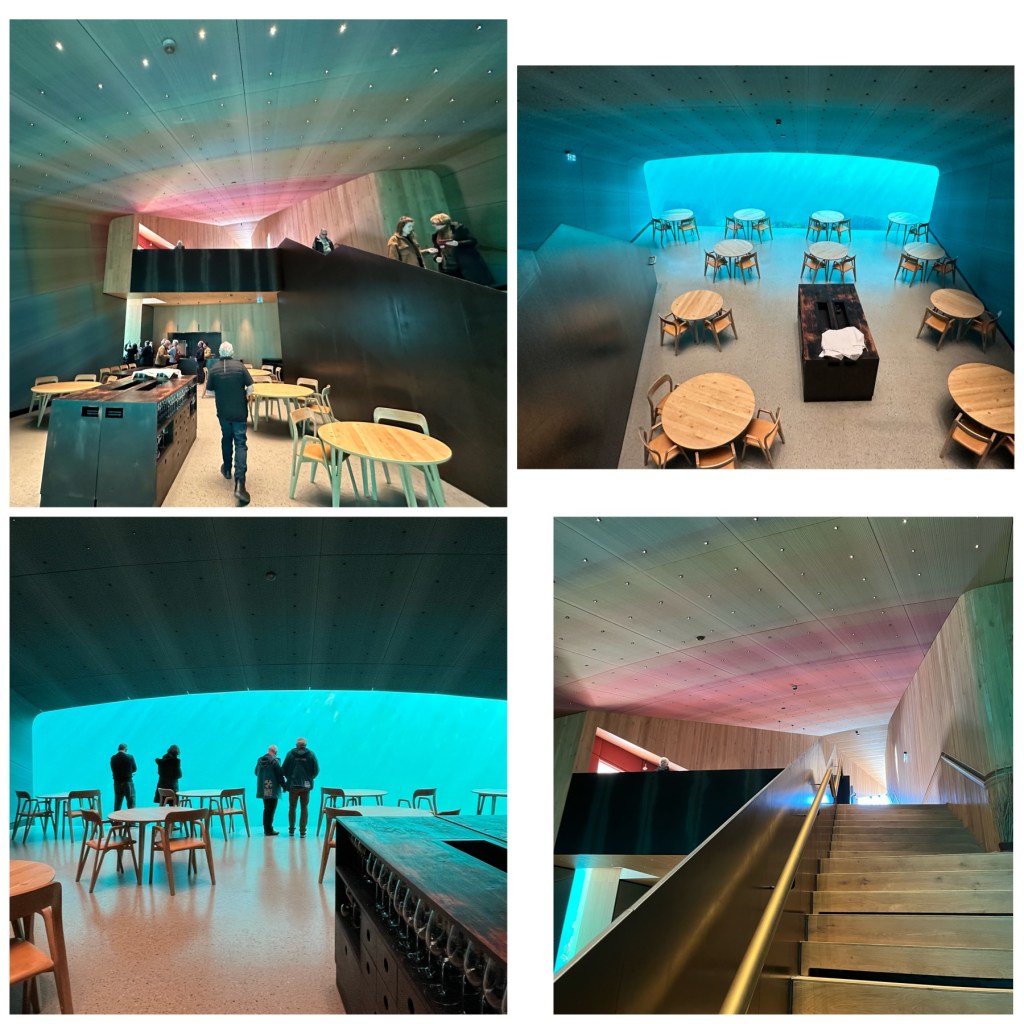 Our first stop is a world famous (even though we have never heard of it) restaurant, Under. This is an underwater restaurant and the dining room is 5.5 metres below sea level. It is an absolute triumph in design, both outside and in. One has the unique view of life underwater, and the interior lighting reflects the northern lights