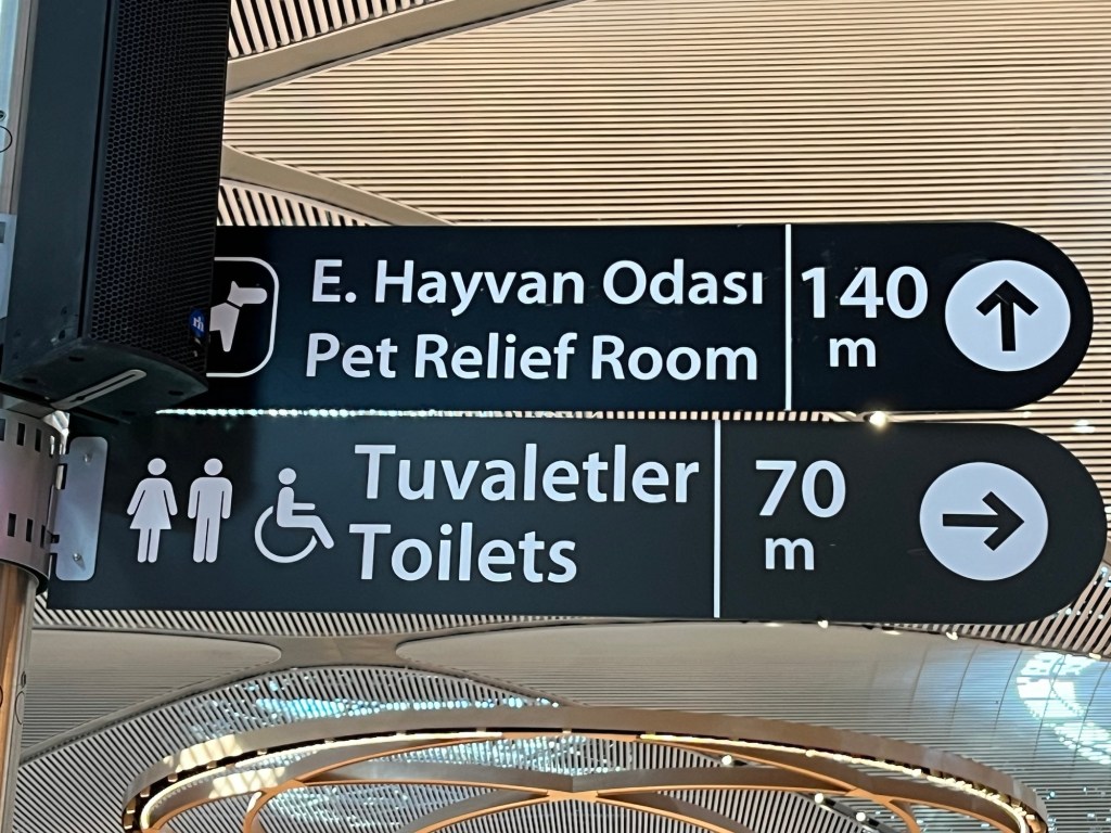 After several hours delay we board our plane, along with the sweetest little dog. Hope he saw this sign before boarding