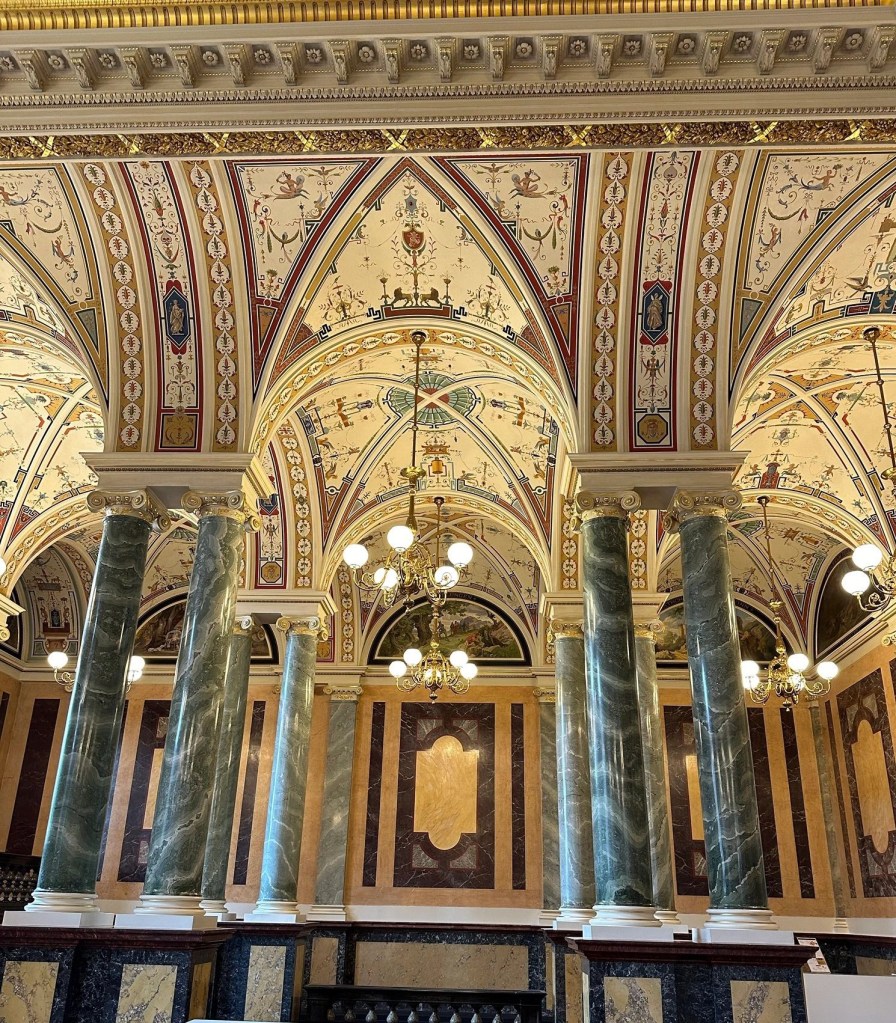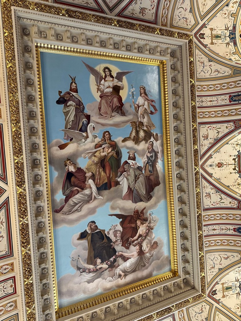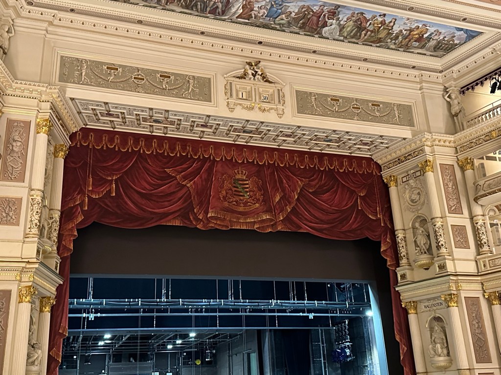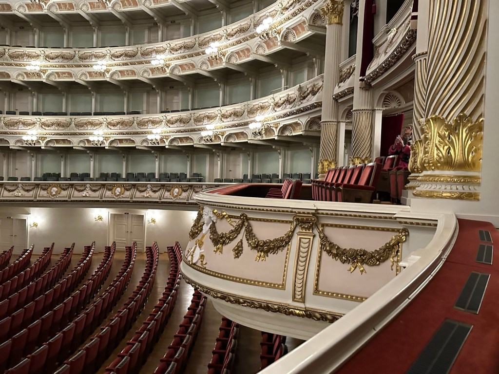 has been rebuilt three times. The first was destroyed by fire in 1869, caused by workmen in the roof welding with gas. The second was destroyed in the 1945 disgrace and this is the third. It’s lavish, both in the foyer and the auditorium, and again a replica of the original