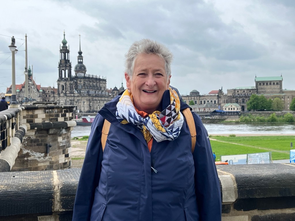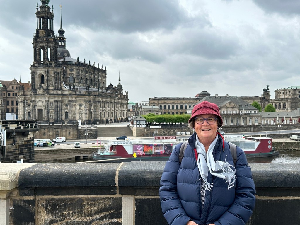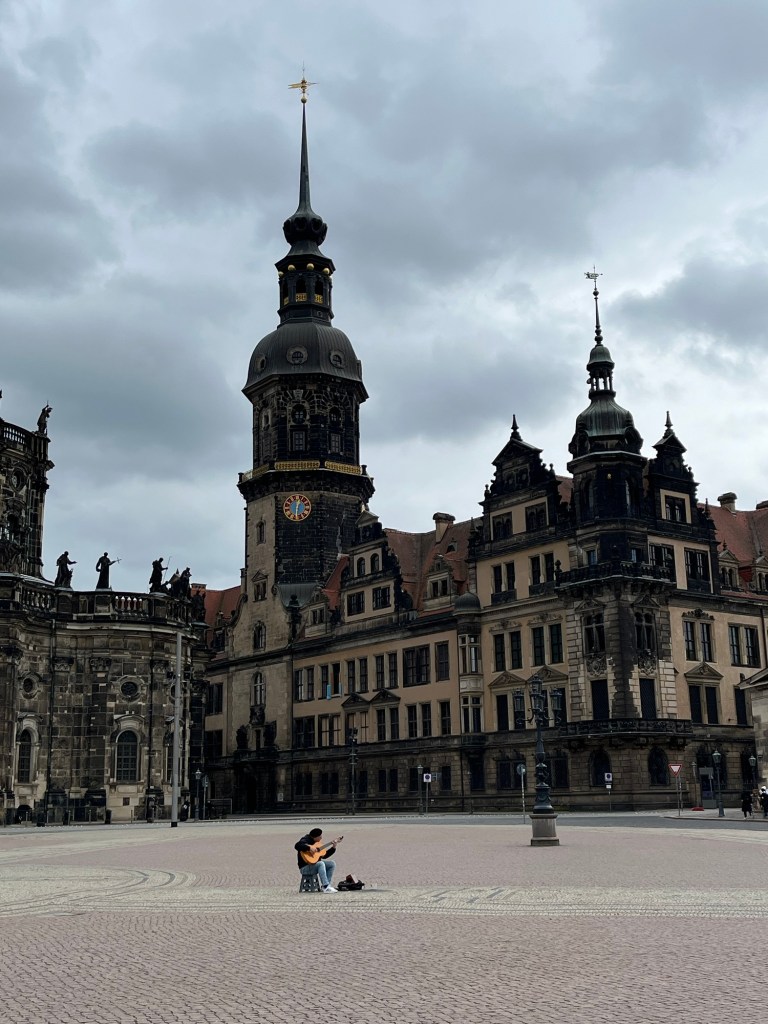 The train travels at 165kmh and we are in Dresden in two hours. We are checked into the hotel, bags in room, by 11am. It’s drizzling, and freezing cold. It was 25 degrees in Dresden last week. Today it’s 7 degrees. I must dispense with my short sleeved rain coat and replace it with something warmer, which I do. Waste not want not, I donate it to a beggar. With short arms.