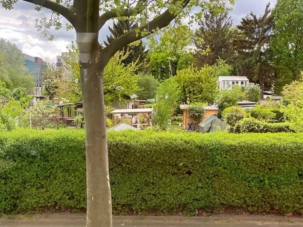 A colourful journey by train through farming country of brown ploughed paddocks, green crops and fields of yellow canola. Also a sustainable journey, past solar farms and wind turbines. When we pass through villages we see that all the houses have garden plots, of varying tidiness and plantings.
